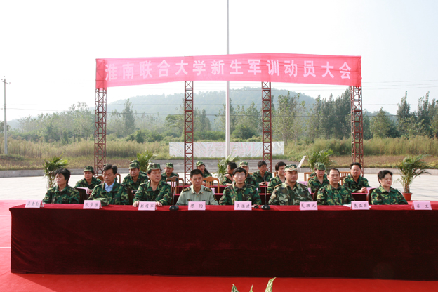 9月10号上午,伴随着庄严的国歌我校2008级新生军训动员大会在教学楼广场举行。校党委书记吴淮建,党委副书记、校长赵耀军,武警淮南市支队副支队长陈豹、教导队大队长夏胜元,副校长耿梦淮、尚文,党委委员吴素勤出席了动员大会。大会由校纪委书记、军训领导小组副组长朱亚非主持。武警淮南支队37名教官,学校军训工作领导小组全体成员和 08级全体受训学生参加了大会。