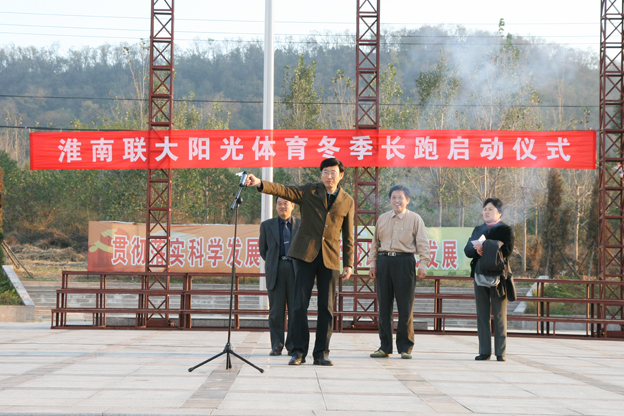 为响应教育部、国家体育总局、共青团中央联合发出的开展第三届全国亿万学生阳光体育冬季长跑活动的号召,让学生积极参加“阳光体育”活动,在快乐中锻炼,在健康中成长,11月03日下午16:30,“第三届全国亿万学生阳光体育冬季长跑淮南联合大学启动仪式”在我校国旗广场举行。校党委书记吴淮建、校长赵耀军、纪委书记朱亚非出席,仪式由副校长尚文主持,系部领导及各系师生两千多人参加了启动仪式。