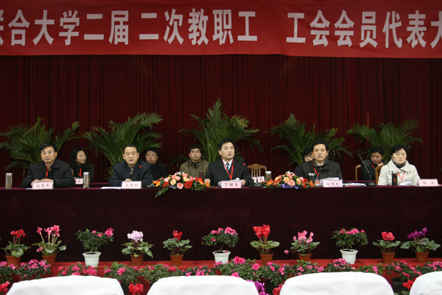 党委书记万继军做重要讲话。讲话指出,刚刚过去的2009年,是学校化危为机、攻坚克难的一年。在办学经费十分困难的条件下,学校上下坚定信心,咬定目标,以开拓创新的精神,保持了逆势前进的发展态势,在教育教学改革、实用型人才培养、师资队伍建设、科研实训、学生管理、校园文化建设、对外交流合作以及加强党的建设等方面取得了可喜的成绩。特别是学校成功举办了建校25周年庆祝活动;完成了新校区实训大楼的奠基;成功申报了省级质量工程项目4项;产出高质量论文151篇,近2年来平均每年获得国家级专利2项;成功举办了“知名企业校园行”活动4次,实现了95%以上的就业率目标,持续保持在全省同类院校前列。这些成绩的取得,凝聚着全校教职工的智慧和力量,也饱含着各位代表的心血和汗水。