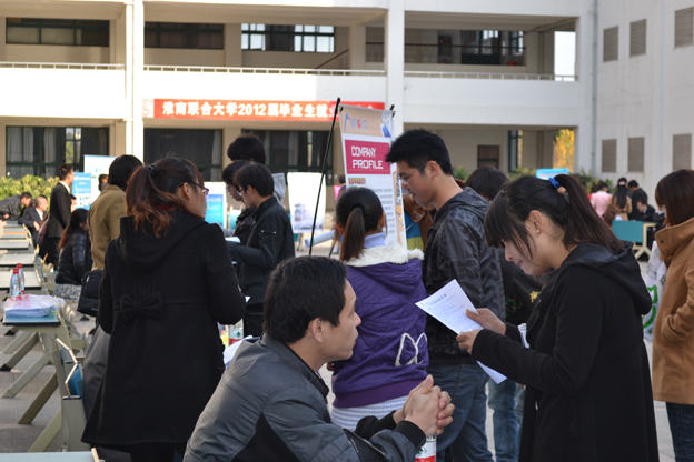 2011年11月20下午,我校在东教学楼广场举办了2012届毕业生就业双选会,参加此次双选会的单位分别来自江苏、上海、浙江及安徽等省市,共有日芯光伏科技、扬子江药业、松下科技、夏普科技等29家单位,招聘岗位2000多个。