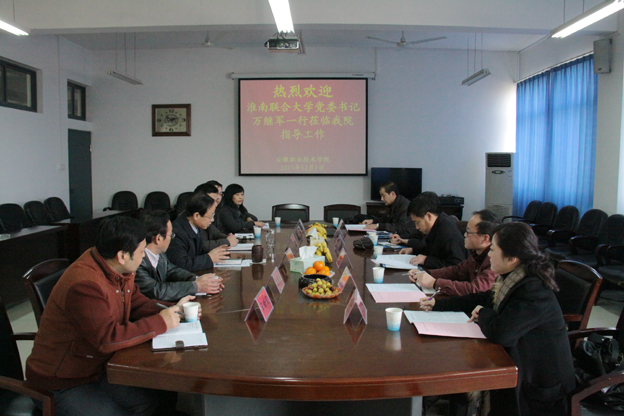 在交流会上,安徽职业技术学院党委书记方徽聪对万书记一行的到来表示热烈欢迎,并简要介绍了学院的基本情况,特别介绍了学院近几年快速发展的经验,主要有:一、要抓住国家支持职业教育的发展机遇,加强人才培养模式、课程改革、师资队伍、实训基地等内涵建设,树立学校发展要有利于广大教职工发展的理念。二、要贯彻落实党委领导下的校长负责制,加强领导班子建设,正确处理好决策权、执行权、监督权的关系,充分发挥校党委的领导核心、政治核心作用。三、要提高行政工作力度,对二级系部实行党政联席会议制度,理顺党政关系。四、要确立学校发展不同阶段的奋斗目标,以凝聚人心,充分调动广大教职工的积极性、创造性。同时,方书记也为我校如何提升办学水平、提升干部水平提出了建议。