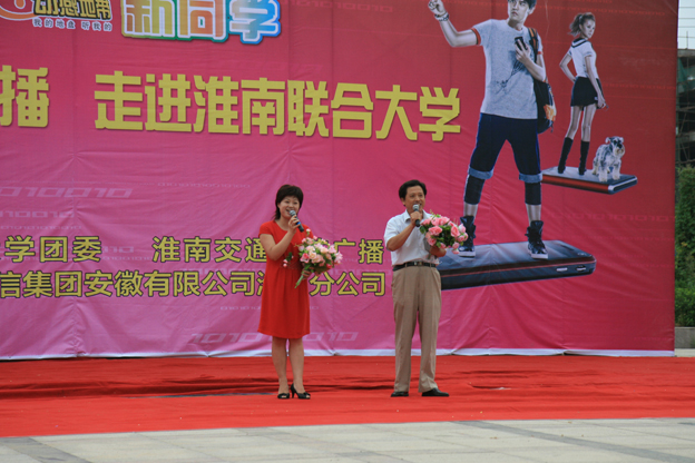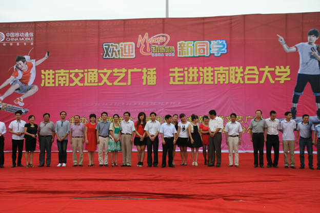 9月5日,由淮南联合大学团委与淮南市交通文艺广播共同主办的文化演出进校园活动在国旗广场正式拉开帷幕。校党委书记万继军、校长赵耀军、副书记朱亚非、副校长尚文、党委委员、组织人事部长白存良,淮南广播电视台党委书记、台长吴新华以及电视台相关领导,中国移动通信淮南分公司总经理顾建华与公司相关领导出席活动。全校几千名同学有序组织共同观看了此次文艺演出。