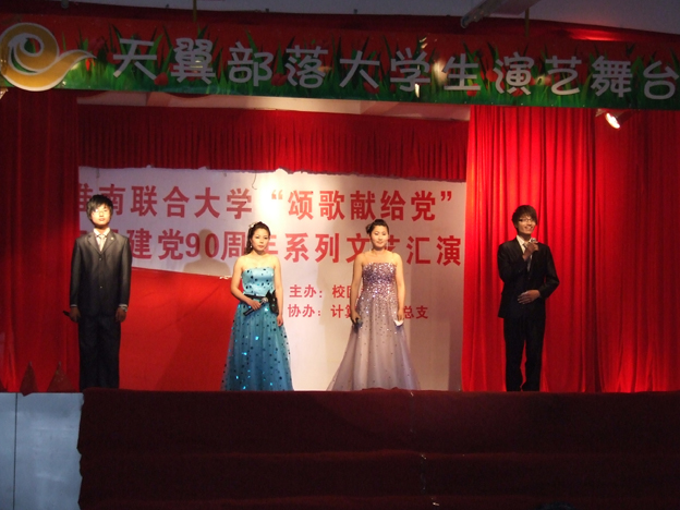 晚会在舞蹈《it is my life》中拉开帷幕。从《黄河大合唱》到《光荣》一首首气势磅礴、旋律优美的经典红色爱国歌曲,同学们用嘹亮的歌声表达出了学子的拳拳赤心,表达了联大人“唱响红歌谣、永远跟党走”的坚定信念和建设和谐校园的美好心愿,抒发了计算机系师生对党对祖国的无限热爱之情;优美的舞姿,表达了我校师生在党的领导下阔步向前的喜悦心情,抒发了对伟大的中国共产党90岁生日的深情祝福。精彩的表演感染了所有观众,而台上台下同唱《国歌》,更是把整台晚会推向了高潮。