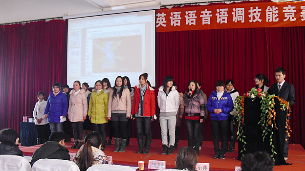 在学校各级领导的大力支持下,在英语专业教师的悉心指导下,由外语系主办的淮南联合大学第七届“英语语音语调技能竞赛”,经过一个月的紧张筹备和精心组织,于1月6日下午,在学校报告厅如期举行。外语系主任马莹、教研室主任董敏、邵卫平和专业语音教师担任本次竞赛评委,校、系有关领导莅临比赛现场观摩指导,外语系全体学生和各系学生代表观看了竞赛。