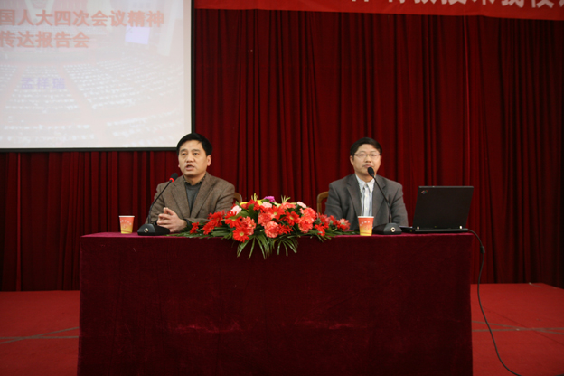 3月25日下午,我校在报告厅举行传达“两会”精神报告会。报告会邀请了全国人大代表、博士生导师孟祥瑞教授传达了十一届全国人大四次会议精神。校党委书记万继军主持会议,校长赵耀军、副书记朱亚非参加了报告会。