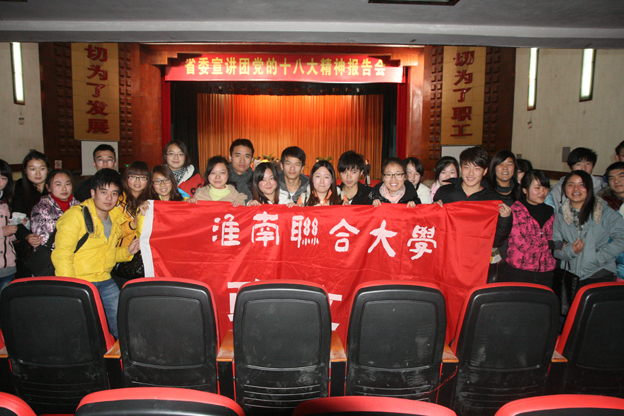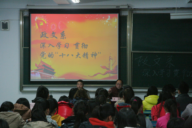 在全党上下不断掀起学习贯彻十八大精神热潮的大背景下,按照校党委统一部署,宣传部联合思政部、各党总支迅速在全校掀起学习宣传贯彻十八大精神热潮。根据《关于做好习宣传贯彻党的十八大会议精神的通知》(淮联党【2012】28号)文件精神,宣传部统一制定学习宣传贯彻十八大精神总体方案;思政部组织骨干教师组成十八大精神宣讲团,深入各党总支进行十八大精神宣讲;学生处、团委组织开展学生喜闻乐见的学习宣传活动;各党总支采取集中学习与分散学习相结合的灵活多样形式,迅速在全校范围内掀起学习贯彻热潮。