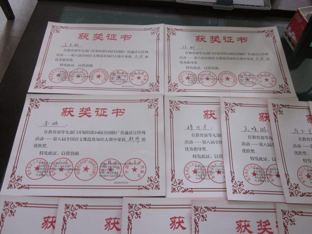 由教育部语言文字应用管理司主办,中国语文报刊协会、中国文字学会、中国广播电视学会、叶圣陶研究会等多家单位联合承办的“第八届全国语文规范化知识大赛”成绩日前揭晓,我校共13人次获奖。政文系学生李玲玲、周王芳、蒋灿、马玉兰、王晓璐、甄儒获大学学生组“优胜奖”,罗鸿、李琳获大学教师组“优胜奖”,王启敏、李琳、陈卿、穆可才、张宝英获“优秀指导奖”。