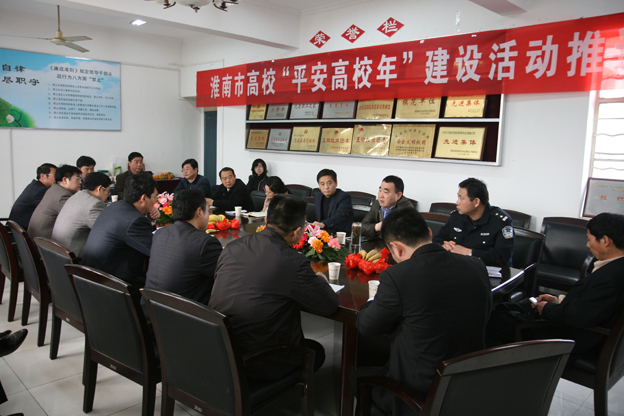 3月29日下午,淮南市高校“平安高校年”建设推进会在我校办公楼会议室召开。校党委书记万继军,副书记朱亚非,淮南市公安局谷饶军副局长,市政法委副调研员徐平主任,国保支队、田家庵公安分局领导,市教育局相关领导,以及所辖派出所所长出席,五所高校保卫处、学生处负责人参加了会议。