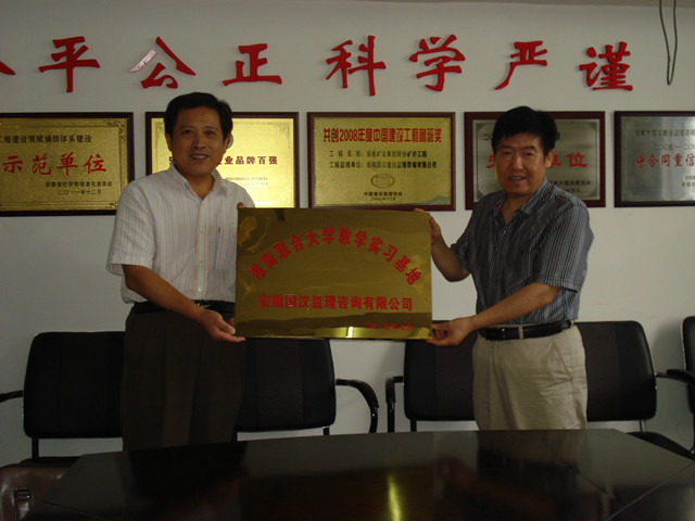 座谈结束后,赵耀军、吴毅分别代表淮南联大与安徽国汉建设监理在合作协议上签字并为实习基地揭牌。安徽国汉建设监理咨询有限公司成立于1997年5月,具有综合监理工程资质和安徽省招标代理乙级资质,是全国百强和安徽省10强监理企业之一,是中国建设监理协会理事、煤炭监理协会、安徽省监理协会常务理事单位。