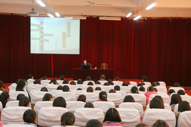 法制讲座由安徽省女子强制戒毒所教育科副科长彭冠娟警官主讲。彭警官首先介绍了毒品的四项基本特性即依赖性、耐受性、非法性、危害性,要求同学们认清毒品的危害,抵制毒品的诱惑。随后,详细说明了毒品的种类如冰毒、摇头丸等常见毒品。彭警官用大量生动、具体的实例,列举了不同的毒品对人体的危害,吸毒贩毒的法律惩罚程度。讲座通俗易懂,会场秩序井然。