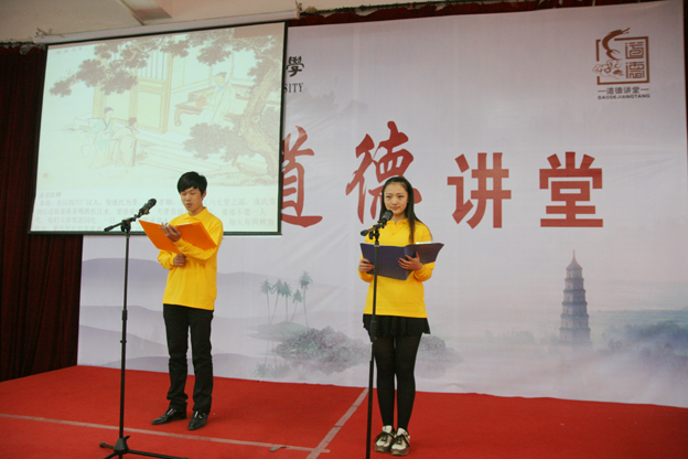 两位学生代表为大家带来道德经典诵读《二十四孝》宣读。