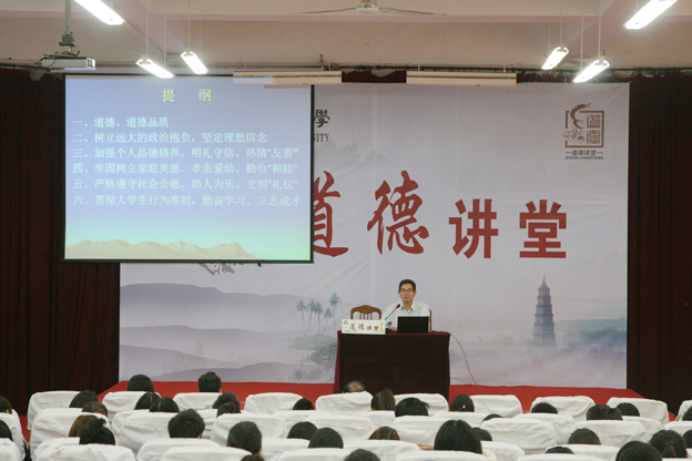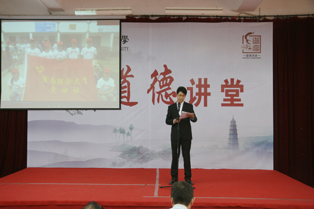 “做一个信得过的人,做一个能自律的人,做一个会孝亲的人,做一个乐助人的人,做一个有抱负的人”。淮南师范学院方川教授为与会的师生作了一场名为《以德立身勤奋学习梦想成真》的专题道德报告。他寄语全校大学生:树立远大的政治抱负,坚定理想信念;加强个人品德修养,明礼守信,热情友善;牢固树立家庭美德,孝老爱亲,勤俭和睦;严格遵守社会公德,助人为乐,文明礼仪;贯彻大学生行为准则,勤奋学习,立志成才。