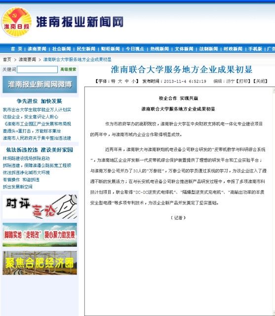 其中,与淮南联翔机电设备公司联合研发的“皮带机教学与科研综合系统”为淮南地区的企业开发新一代皮带机综合保护装置,提供了理想的研发平台和工业实验平台;与淮南万泰公司签订了30人的“万泰班”将为该企业注入发展活力;在与长安机电设备公司的新产品研发中,联合申报了多项淮南市科技计划项目,联合取得 “DC-DC逆变式电焊机”(实用新型专利)、“隔爆型逆变式充电机”(实用新型专利)、“高输出功率的本质安全型电源”(发明专利),为该企业新产品开发奠定了坚实基础。2013年招生人数达3036人,为2010年的160%,录取率和报到率都位居全省前列;学校多次获安徽省就业先进单位,毕业生得到了企业、用人单位和社会的高度认可。
