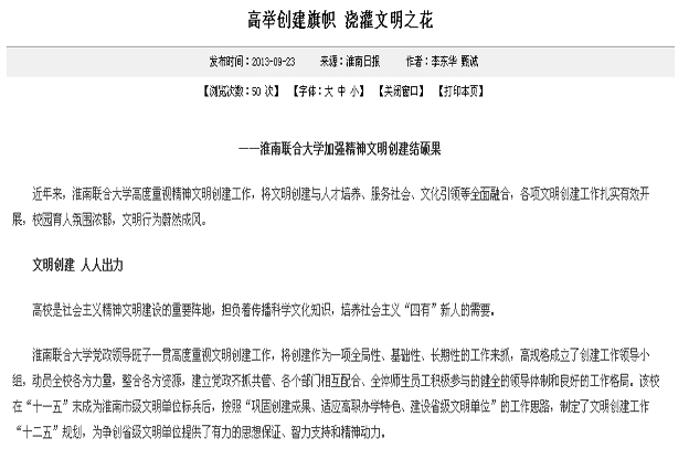 2013年9月23日,淮南日报以“高举创建旗帜 浇灌文明之花—淮南联合大学加强精神文明创建结硕果”为题,专题报道我校精神文明建设。人民网安徽频道、中国日报网、安青网等多家媒体转载。