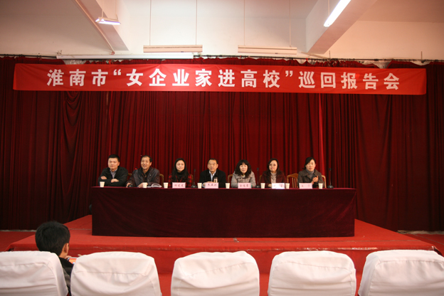 报告会上,淮南市润莹农业开发有限责任公司董事长常莹,淮南市启迪电子有限公司企业法人杨斐斐,分别用自己的亲身经历和睿智的语言为在场的领导和师生作了一场催人奋进的报告,两位女企业家从各自的创业历程演绎的动人故事,给广大师生带来很大的触动与启示,并和同学们一起分享自己的创业体会和人生感悟。市人社局失业保险和创业指导科陈磊就国家、省、市出台的一系列鼓励和支持大学生创业的政策措施进行了详细阐述,他鼓励同学们要把握机会、用好政策、积极创业,努力实现自己的人生价值。精彩的报告不时赢得在场听众热烈掌声。