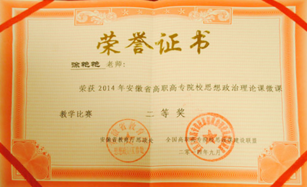 在2014年7月至9月由安徽省教育厅思政处、全国高职高专院校思想政治理论课建设联盟联合主办的全省高职高专院校思政课微课比赛中,我校徐艳艳老师荣获二等奖。