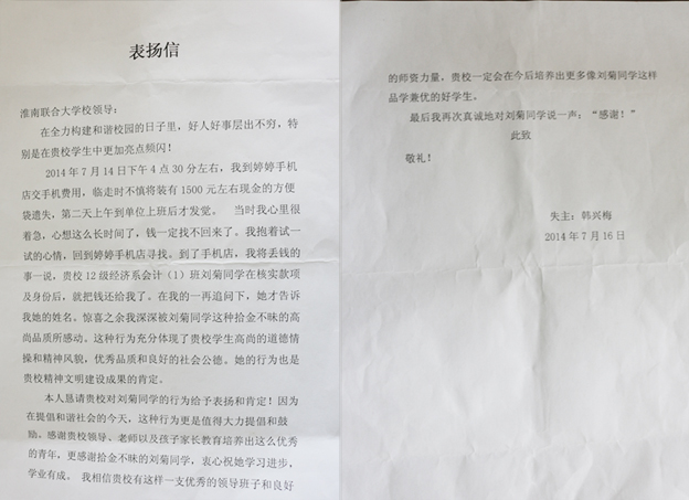 经济系2012级会计①班刘菊同学在暑假社会兼职期间,拾金不昧,用实际行动展现了淮南联大学生优秀的个人品质,充分体现了我校学生高尚的道德情操和精神风貌,受到失主和周边老百姓的交口称赞,为学校赢得了良好的社会声誉。