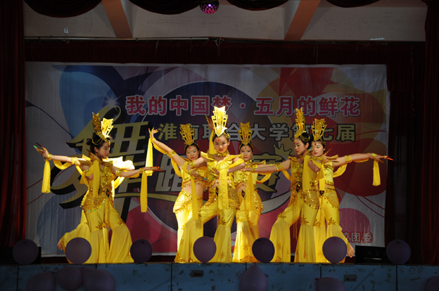 在同学们热烈的掌声中第七届舞蹈大赛正式开始。大赛以民族舞为主,共有12支代表队,有温雅婉约的蒙古舞,有节奏明快的印度舞……绚丽的服装、动感的舞姿、明快的节奏,让观众们纷纷叫好。经过激烈比赛,最终《阿拉伯之夜》取得冠军。