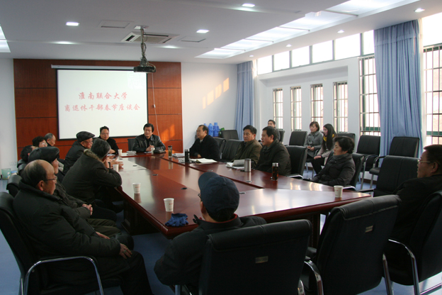 元月14日下午,我校在实训楼一楼会议室隆重召开离退休干部春节座谈会。校党委书记万继军,校长赵耀军,副书记朱亚非,副校长尚文出席了会议,工会、办公室负责人及10名离、退休老同志参加了座谈会。会议由党委书记万继军主持。