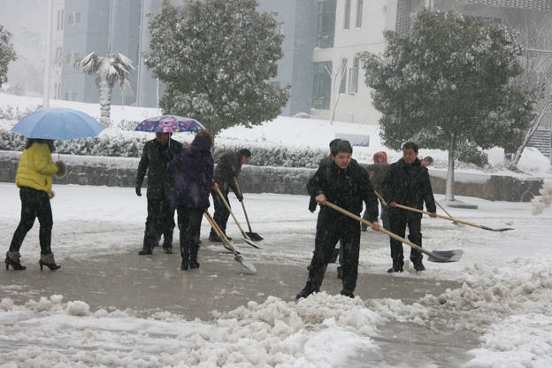 2月18日上午,淮南市迎来一场暴雪,给校园道路交通、生活、出行带来了诸多不便。为及时清除积雪,确保交通安全和师生出行方便。校党委书记万继军,校长赵耀军,副书记朱亚非,党委委员、组织人事部部长白存良,行政人员等组成志愿者队伍,开展义务除雪活动。本次除雪从国旗广场至食堂,虽然天气寒冷,但是志愿者热情十分高涨。扫雪过程中,志愿者们不顾天寒路滑,分工明确,配合默契,经过一个多小时的努力,路上的积雪终于清理干净了。志愿者们的头上都渗出了汗珠,虽然感觉有点累,但看到师生在清扫干净的道路上行走仍然感到心里很温暖。