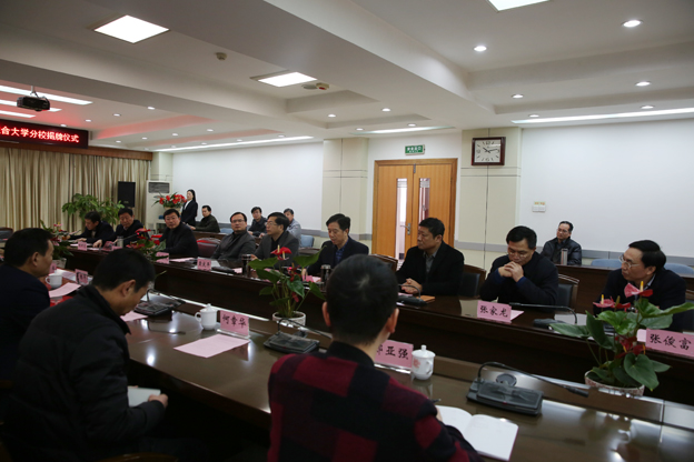 12月31日上午,我校与中化三建合作办学签约暨成立淮南联合大学分校揭牌仪式在中化三建办公楼三楼会议室举行。校党委书记万继军,校长李辉,中化三建董事长、党委书记黄庆平,中化三建董事、总经理刘玉华,副校长尚文,副校长白存良,安徽动力工程学校校长、党委书记,淮南联合大学分校负责人吕新国等领导出席大会。中化三建副总经理顾士新主持会议。