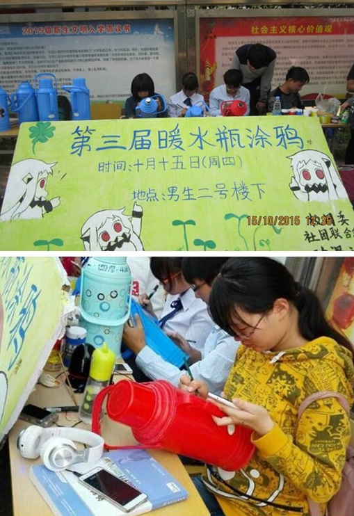 为营造和谐健康的校园文化氛围,丰富大学生的课余生活,10月15日,由校团委主办、动漫社承办的第三届暖水瓶创意涂鸦活动在学生宿舍区成功举行。