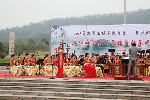 11月4日下午,由安徽省委宣传部、省教育厅、省文化厅共同主办的2015校园大舞台——徽风皖韵进高校《民族管弦乐团专场音乐会》演出在我校国旗广场举行。党委书记万继军,校长李辉,副校长尚文,纪委书记白玫,党委委员、工会主席薄勇,党委委员、组织人事部部长卞霞以及淮南市职教集团代表与广大师生一起观看了演出。