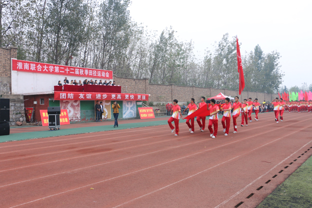 8时30分,伴随着雄壮高亢的《运动员进行曲》,在鲜艳的国旗和校旗引领下,8个系的运动员代表组成整齐有序的方阵,迈着矫健的步伐有序步入运动场。