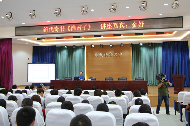 9月17日下午,我校在南区报告厅举办道德讲堂活动。本次道德讲堂由我校党委宣传部和市文广新局共同主办,邀请了安徽省《淮南子》研究会的专家金妤作了题为《绝代奇书〈淮南子〉》的讲座。市文广新局局长方斌、副校长白存良和二百余名师生共同聆听了讲座。