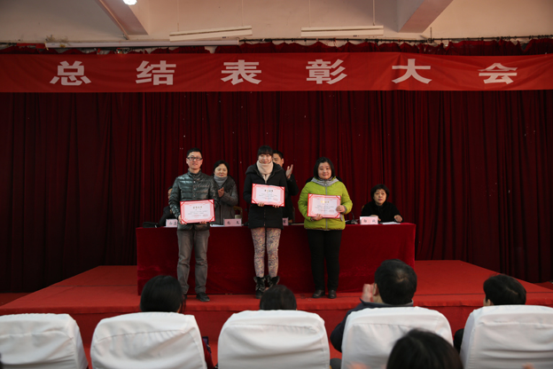 纪委书记白玫宣读《关于2014年年度考核结果的通报》和《关于表彰先进集体 优秀教师优秀教育工作者 颁发老同志贡献奖的决定》。校领导为获表彰的代表颁发荣誉证书。