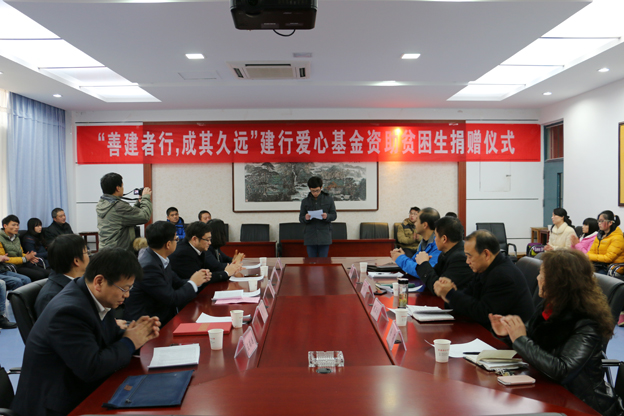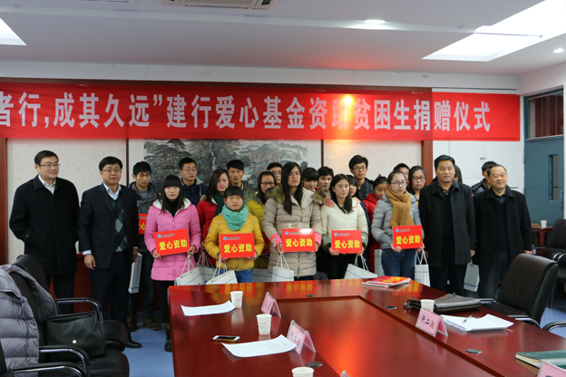 1月6日下午,我校在实训楼会议室内举行了中国建设银行“爱心基金”助学金颁发仪式。校党委书记万继军、副书记朱亚非、建行淮南分行党委书记、行长计金保、副行长吴永刚、张松茂等领导出席。学生处、财资处负责同志、受资助学生参加了仪式。