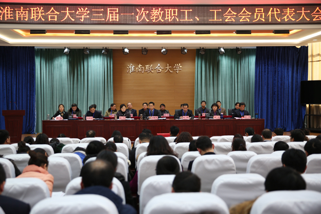 1月15日上午,淮南联合大学三届一次教职工、工会会员代表大会在一号报告厅隆重召开。校党委书记万继军,校长李辉,副校长尚文,纪委书记白玫,副校长白存良,党委委员、工会主席薄勇,党委委员、组织人事部部长卞霞出席大会。正式代表、列席代表、特邀代表共98人参加大会。