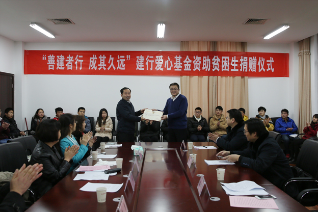 1月7日下午,我校在办公楼三楼会议室举行了中国建设银行淮南分行“爱心基金”助学金颁发仪式。校长李辉,建行淮南分行副行长张松茂,校纪委书记白玫,党委委员、工会主席薄勇,党委委员、组织人事部部长卞霞等领导出席。学生处、财资处负责同志、19名受资助学生参加了仪式。