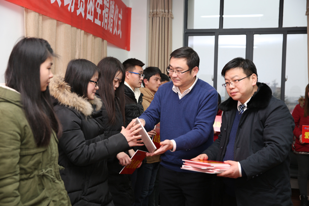 李辉向建行淮南分行颁发了捐赠证书。张松茂介绍了设立“爱心基金”捐助贫困学生的背景,表达了建行淮南分行始终秉承“与客户同发展、与社会共繁荣”的理念,在服务民生与实体经济的同时,更积极履行社会责任。他勉励同学们要自强不息,励志成才。期待银校双方合作再上新台阶。