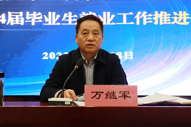 万继军在讲话时充分肯定了学校2023届毕业生就业工作的成效,对2024届毕业生就业工作进行了部署,并提出了四点要求:一是肯定成绩,总结经验;二是认清形势,提高认识;三是突出重点,狠抓落实;四是抓早抓快,稳步推进。万继军指出,要深入贯彻全国、全省2024届普通高校毕业生就业创业工作视频会议精神,进一步提高政治站位,把促进高校毕业生高质量充分就业摆在教育强国建设的战略高度通盘考虑,把确保高校毕业生就业大局稳定作为稳就业工作的重中之重。他强调,24届毕业生就业工作要及早行动起来,做好穿针引线的工作,搭建桥梁,畅通渠道。了解学生的思想动态、就业意向,对实习学生进行全面跟踪、引导,搞好就业服务,了解政策、运用政策,做好就业创业政策宣传。
