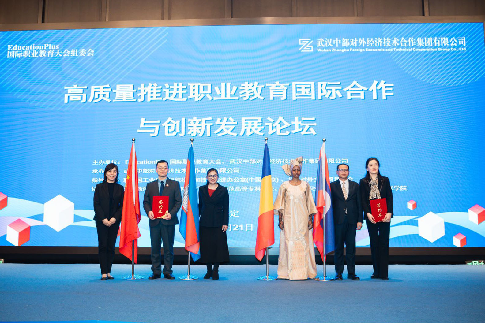 12月21日上午,在高质量推进职业教育国际合作与创新发展论坛上,我校与武汉中部对外经济技术合作集团就职业教育国际合作达成共识。在乍得职业培训、小手工业与小额信货部副部长MBAIRO TOG-NAYE RAMADJI(姆拜罗·托格-纳耶·拉马吉)女士、柬埔寨劳工部副部长、国务秘书 H.E.Laov Him (刘恒) 先生、老挝教育体育部副部长 Dr.Sourioudong Sundara (苏里乌冬·孙达拉) 博士见证下,我校与武汉中部对外经济技术合作集团签署了职业教育国际合作备忘录,双方就中外联合办学、海外实习实训、师资培训、留学等达成了合作意向。