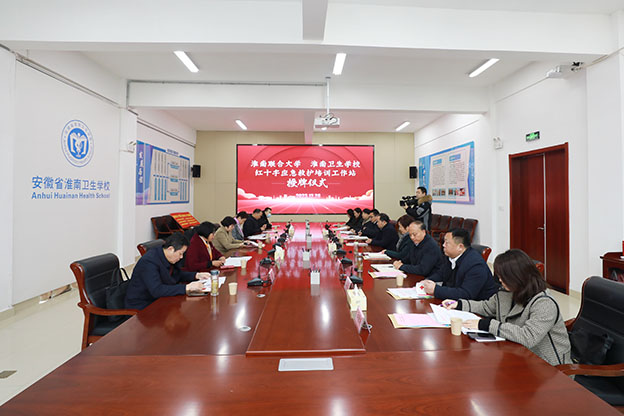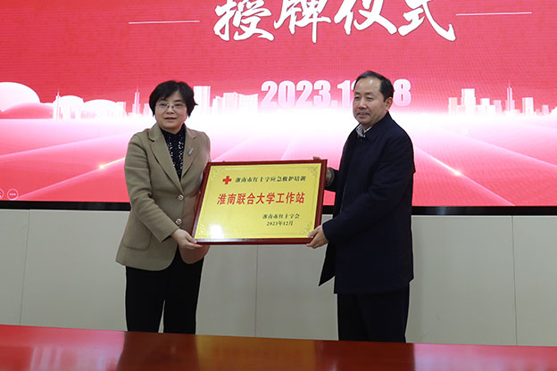 为深入贯彻落实习近平总书记“人民至上、生命至上”的重要指示批示精神,进一步落实《中国红十字会总会教育部关于进一步加强和改进新时代学校红十字工作的通知》和《教育部办公厅中国红十字会总会办公室关于进一步推进学校应急救护工作的通知》精神,12月28日上午,淮南市红十字会在淮南市卫生学校明德楼会议室,为淮南联合大学、淮南卫生学校举行应急救护培训工作站授牌仪式。淮南市副市长、市红十字会会长陆晞,淮南联合大学党委副书记、校长李辉,淮南市政府副秘书长、市红十字会副会长杨倩,淮南市红十字会专职副会长陈玉琴,淮南联合大学党委委员、淮南卫生学校党委书记孙娟,淮南市教育体育局副局长洪光社,淮南市卫健委副局长邸允辉,淮南市应急管理局副局长张所等出席授牌仪式。仪式由陈玉琴主持。