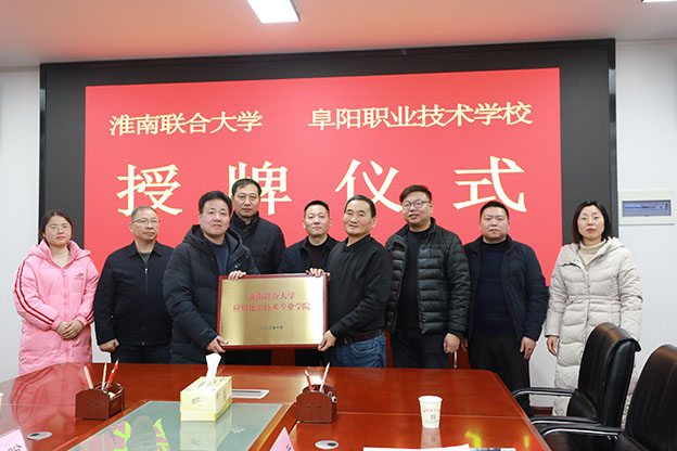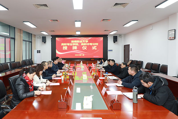 1月16日,我校与阜阳职业技术学校和淮南经济技术学校在办公楼一号会议室举行高职专业学院和高职中专学校授牌仪式。校党委副书记白存良、阜阳职业技术学校校长张平和淮南市职业教育中心党委委员、纪委书记廖仲达出席授牌仪式,会议由副校长黄伟主持。授牌学校、我校教务处、党政办公室、制药与材料学院和人文与外国语学院相关负责同志参加授牌仪式。