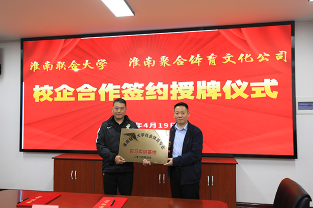 随后,在与会同志的共同见证下,双方签订了校企合作协议。黄伟对淮南聚合体育文化传媒有限公司作为我校社会体育专业学生实习实训基地进行了授牌。