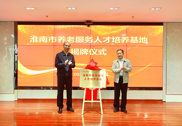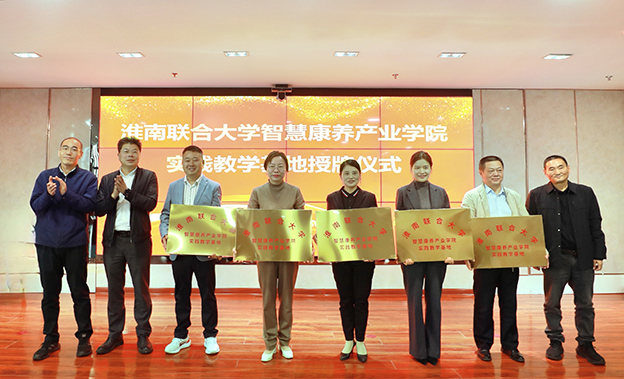 白存良、宫涛、张新辉为淮南联合大学智慧康养产业学院实践教学基地授牌。乌吉副市长和李辉校长为淮南市养老服务人才培养基地揭牌。