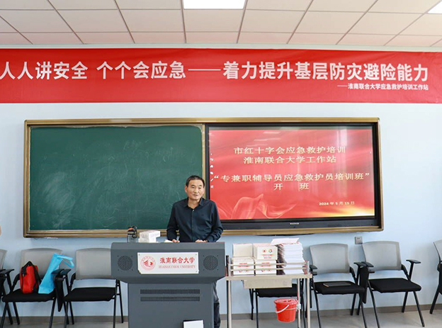 5月11日至17日为防灾减灾宣传周,围绕 “人人讲安全、个个会应急——着力提升基层防灾避险能力”的主题,5月15日下午,学生处与市红十字应急救护培训淮南联合大学工作站共同组织的“专兼职辅导员应急救护培训专班”在医学楼320教室顺利举办。校党委副书记白存良出席开班式。开班式由学生处处长程李平主持。