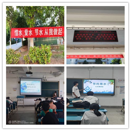 期间,学校还在学校教学主楼的电子屏幕上,不断滚动播放节水宣传口号。在校园内悬挂了醒目的节水宣传条幅,并设置了专题展板,以加深同学们对节水重要性的认识。各学院召开主题班会,举办专题节水讲座,并利用网络平台进行宣传。