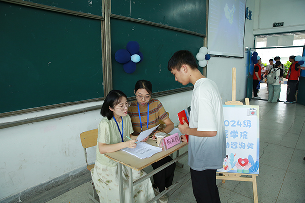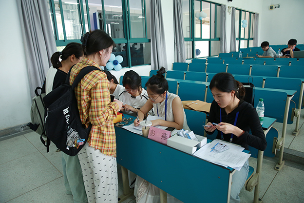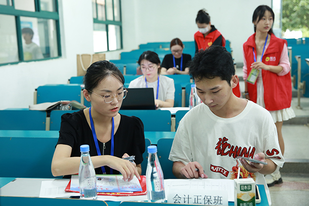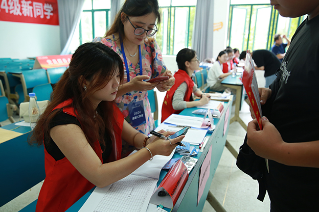 迎新工作人员们早早坐阵,热情地为新生办理报道,新生注册、完成缴费、班级报到、领取生活物品、登记住宿等流程精细化、人性化、智能化,一切工作井然有序、有条不紊,让新生和家长更省心、更安心。