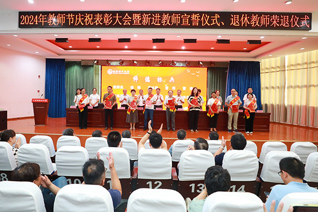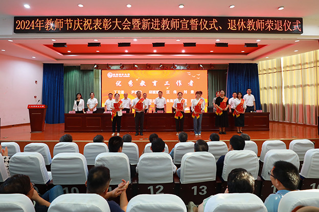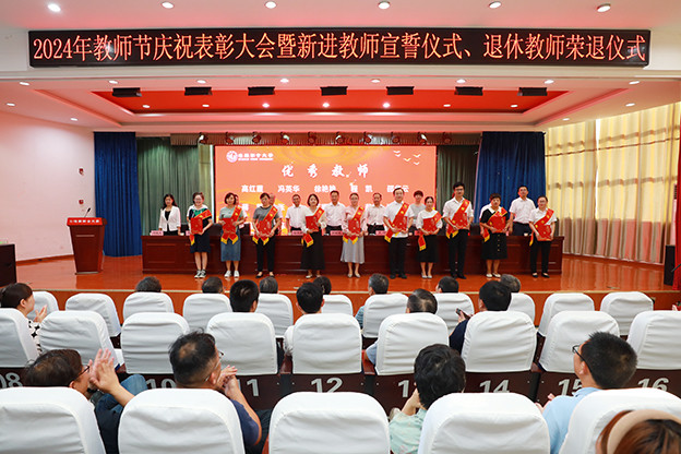 会上,朱银斌首先宣读了《关于表彰“师德标兵”“优秀教师”“优秀教育工作者”的决定》。校领导为受表彰的教师颁发了荣誉证书,共表彰了14名“师德标兵”、13名“优秀教师”和10名“优秀教育工作者”。受表彰代表在会上作了交流发言,分享了自己在教育教学工作中的优秀成果和动人故事。随后,举行了2024年新进教师宣誓仪式和退休教师荣退仪式。校领导为2024年退休教师颁发了光荣退休证书,新进教师代表向退休教师献上鲜花表示祝福。退休教师代表和新进教师代表分别作了交流发言。