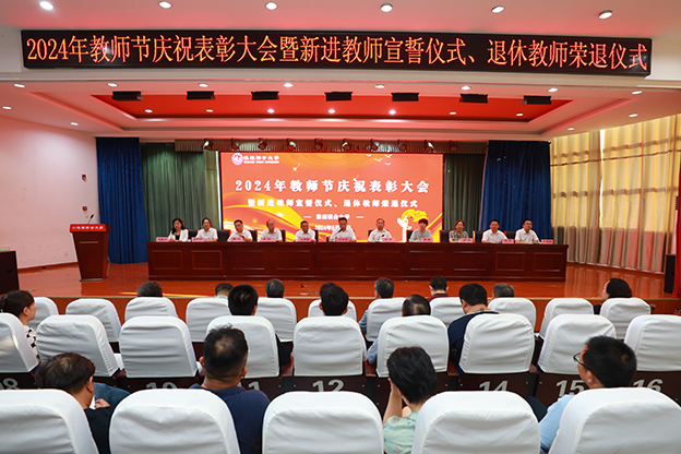 9月10日下午,我校在南区1号报告厅隆重召开2024年教师节庆祝表彰大会暨新进教师宣誓仪式、退休教师荣退仪式。校党委书记万继军,校长李辉,党委副书记白存良,副校长邓琪,副校长罗鸿,党委委员孙娟,纪委书记郑斌,副校长黄伟,党委委员、宣传统战部部长史学丽,党委委员、组织人事部部长朱银斌,党委委员、科研处处长何晓文出席会议。副科级以上干部、专职辅导员、受表彰人员、教师代表、2024年退休教师代表以及2024年新进教师参加会议。会议由李辉主持。