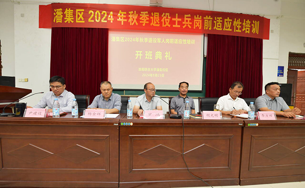 9月23日下午,潘集区2024年秋季退役军人岗前适应性培训开班典礼在我校潘集校区一楼多媒体教室举行。副校长罗鸿、市退役军人事务局三级调研员胡光明、市退役军人事务局就创科科长杨金辉、潘集区退役军人事务局局长李方田出席仪式。仪式由继续教育学院院长、潘集校区负责人尹建设主持,近70名退役军人参加。
