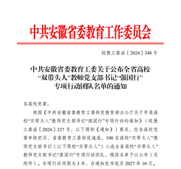 近日,省委教育工委公布《全省高校“双带头人”教师党支部书记“强国行”专项行动团队》名单,我校信息工程学院应用技术教研室党支部成功入选。
