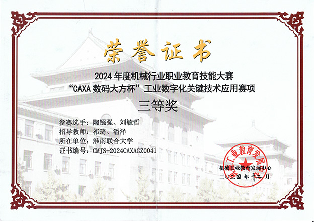 12月8日,由机械工业教育发展中心主办,台州职业技术学院承办的2024年度“CAXA数码大方杯”工业数字化关键技术应用赛项圆满落幕。此次大赛吸引了全国79所高职院校的89支队伍参赛,共同争夺高职组的荣誉。我校智能制造学院的学生作为参赛新军,在此次大赛中荣获高职组全国三等奖的佳绩。