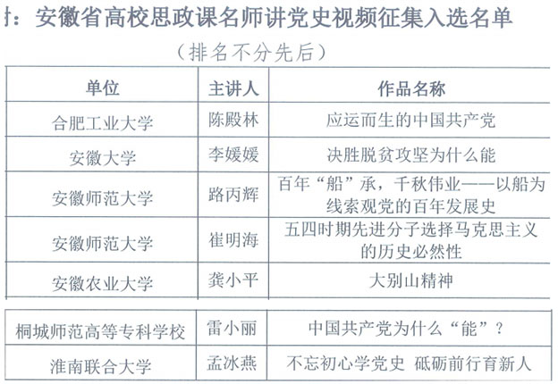 2021年4月,马院孟冰燕副教授录制的《不忘初心学党史 砥砺前行育新人》教学视频成功入选全省高校“思政课名师讲党史”栏目;获 2022 年安徽省教师能力大赛高职高专院校公共课教学组二等奖2项;2023年安徽省教师能力大赛高职高专院校公共课教学组三等奖1项;2024年安徽省教师能力大赛高职高专院校公共课教学组二等奖1项,三等奖1项。2023年获淮南市大中小思政课一体化教学比赛二等奖1项。2024年获淮南市大中小思政课一体化教学比赛三等奖2项。