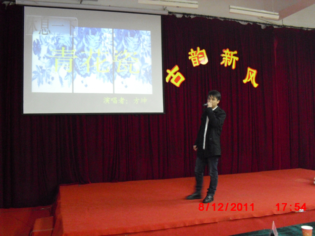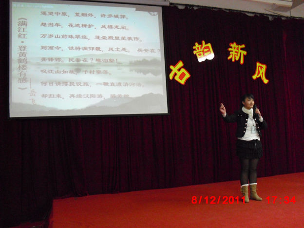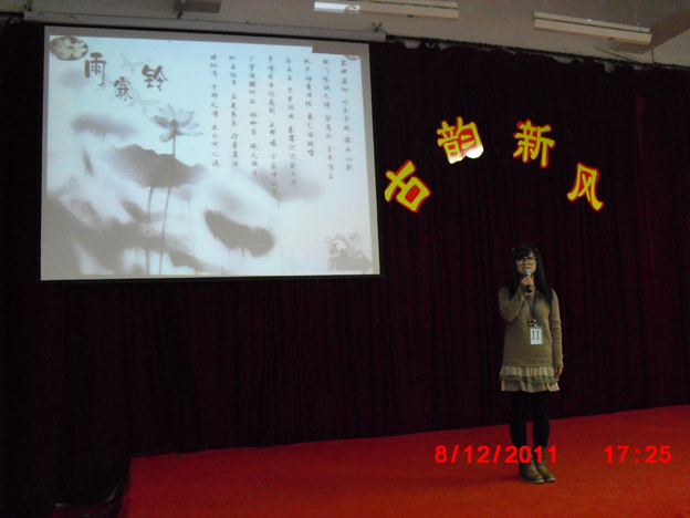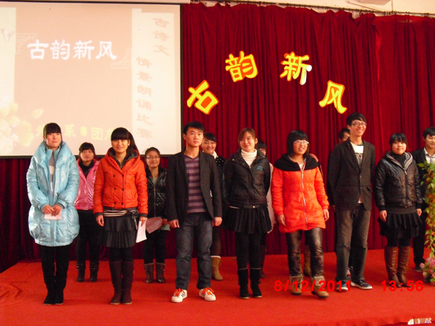 为了培养外语学子的文学气息,营造富有诗意的文化氛围,大力弘扬民族文化,陶冶学生情操,提高文学艺术修养,促进学生身心和谐发展,外语系团总支于2011年12月8日下午4:30在西区220报告厅,举行了“古韵新风” 第四届古诗文情景诵读比赛。